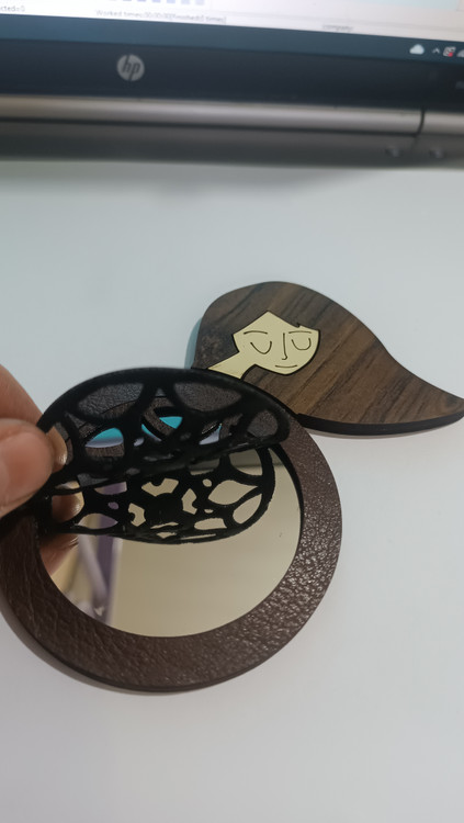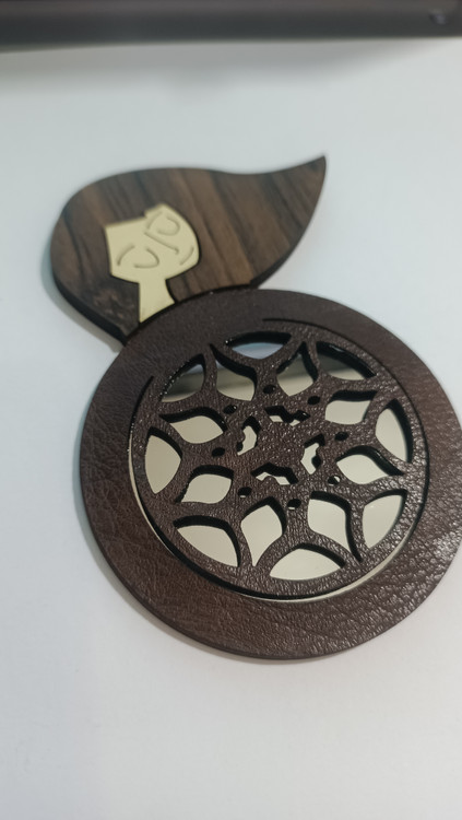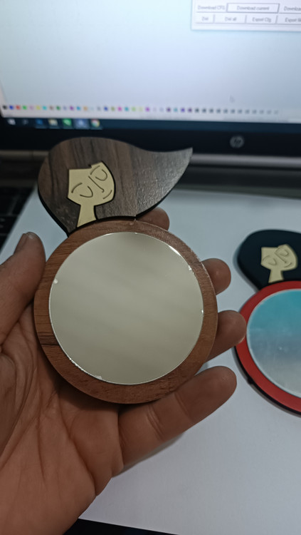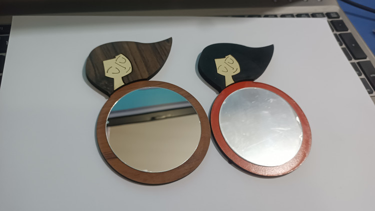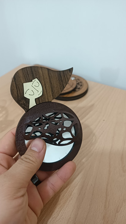 اینه جیبی حدودا 9 سانت از چوب 3 میل ساخته شده و رویه چرم دارد