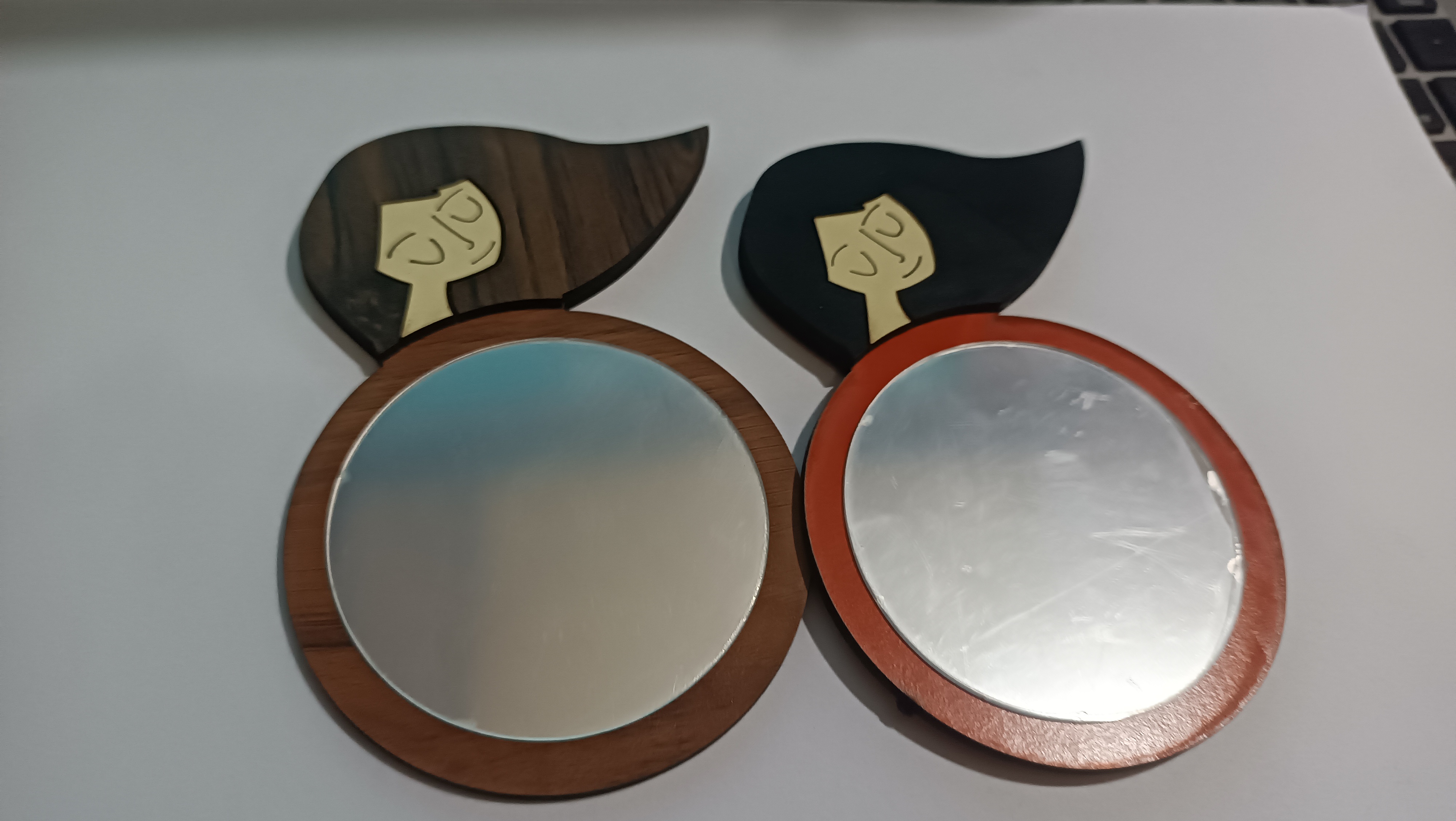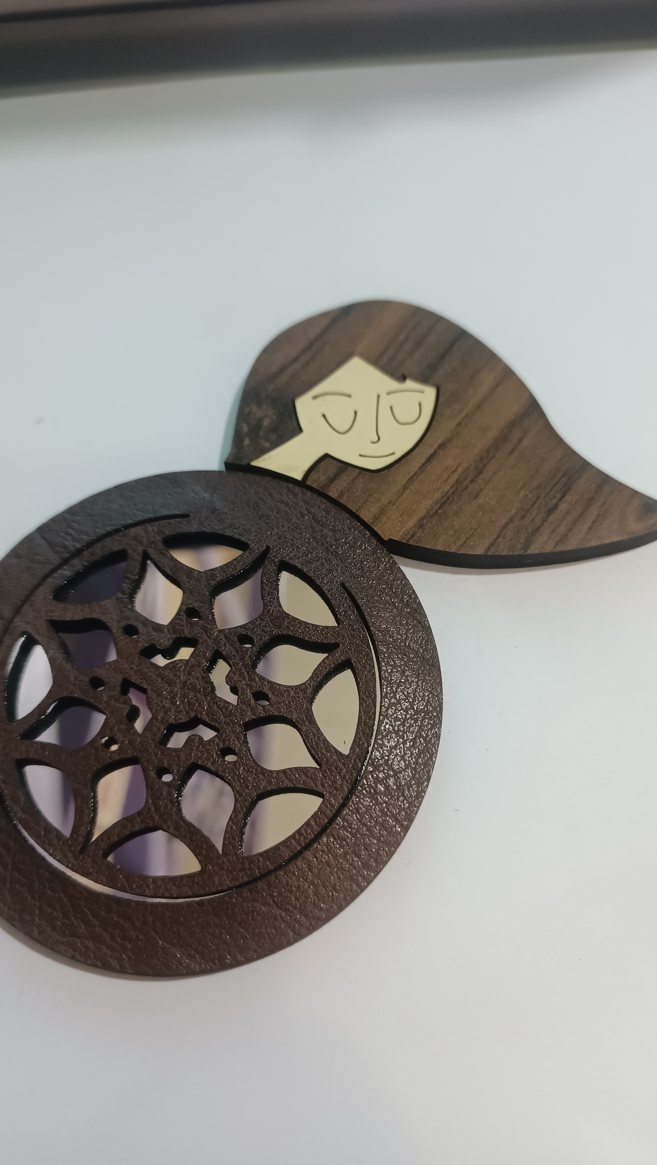 اینه جیبی حدودا 9 سانت از چوب 3 میل ساخته شده و رویه چرم دارد